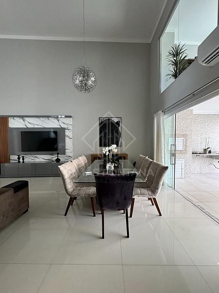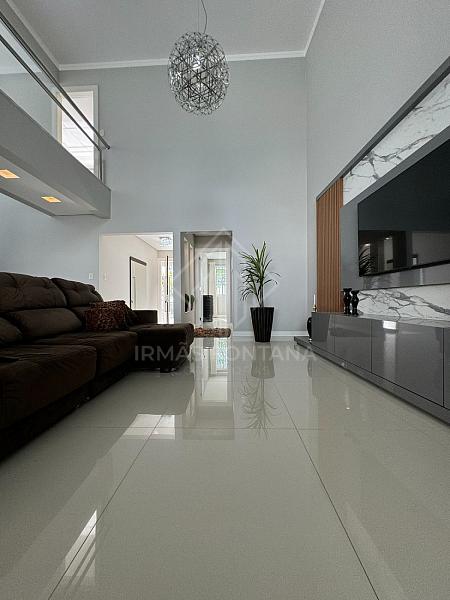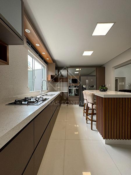 No piso inferior, o amplo living com pé direito de 6 metros impressiona pela sua grandiosidade e luminosidade natural, criando um ambiente perfeito para receber visitas e desfrutar de momentos em família. A cozinha, moderna e funcional, está conectada à sala de estar/TV, promovendo a integração dos ambientes. O sobrado contém ainda dois lavabos, estrategicamente posicionados para atender tanto os moradores quanto os convidados, além de uma área de serviço bem equipada para maior conveniência.